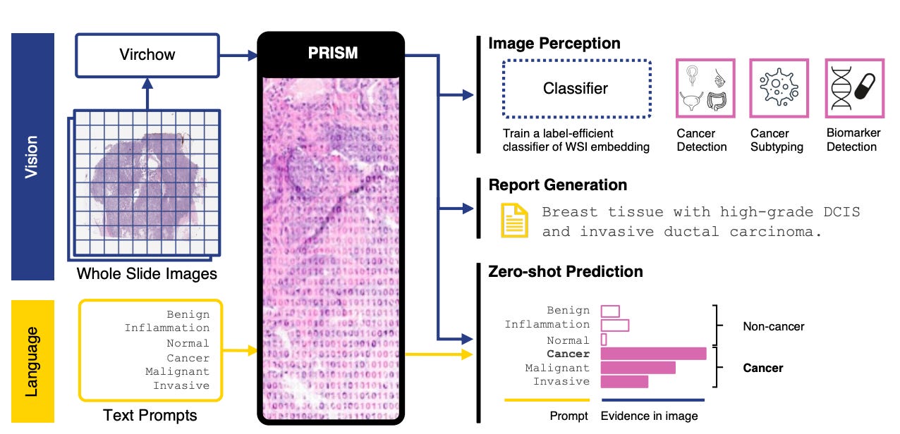 Paige's Virchow & PRISM: Virchow broke new ground as one of the first large pathology foundation models trained on over 1 million slides and openly released on Hugging Face. This was both unprecedented and a bold statement about the power of open collaboration to fuel digital pathology forward. PRISM extended this foundation to vision-language tasks, enabling draft report generation that bridges what AI sees with how pathologists communicate.